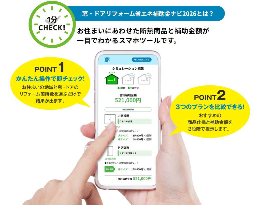 お住まいにあわせた断熱商品と補助金額が一目でわかるスマホツールです。